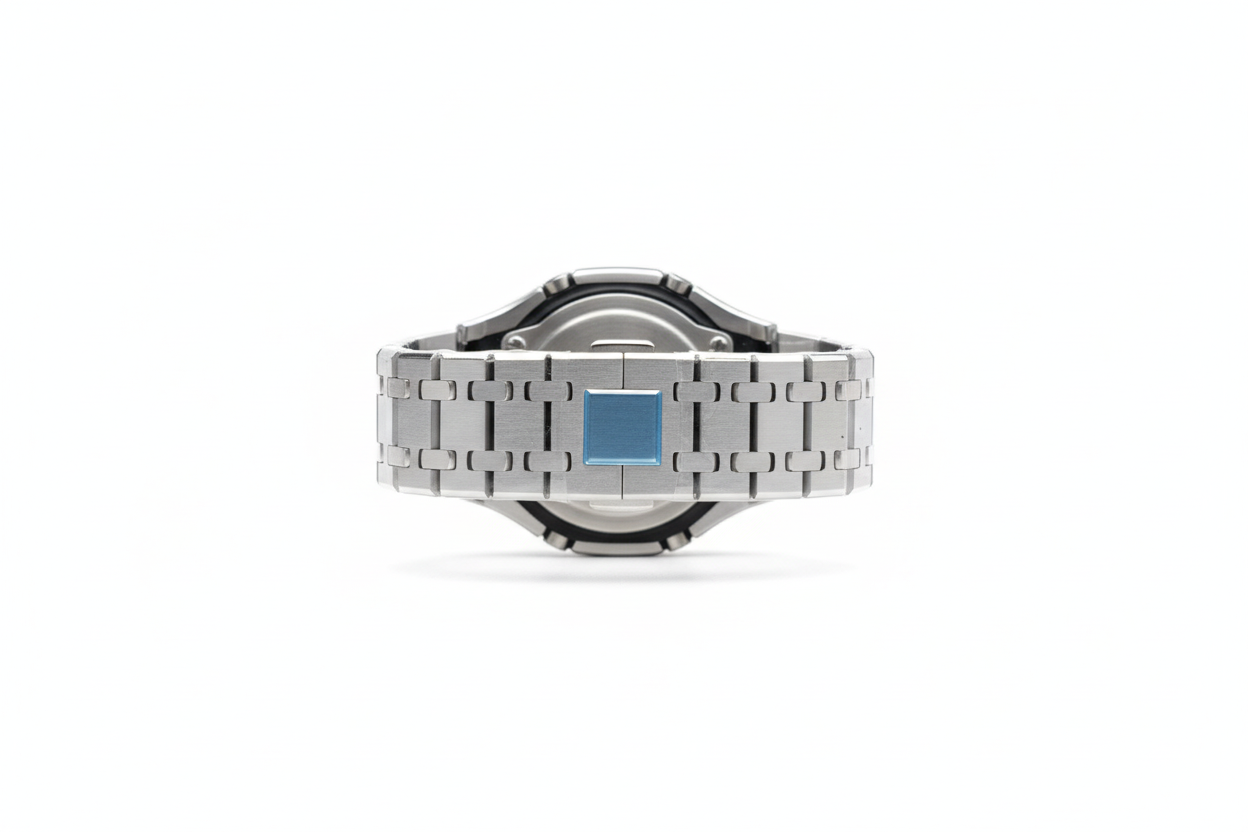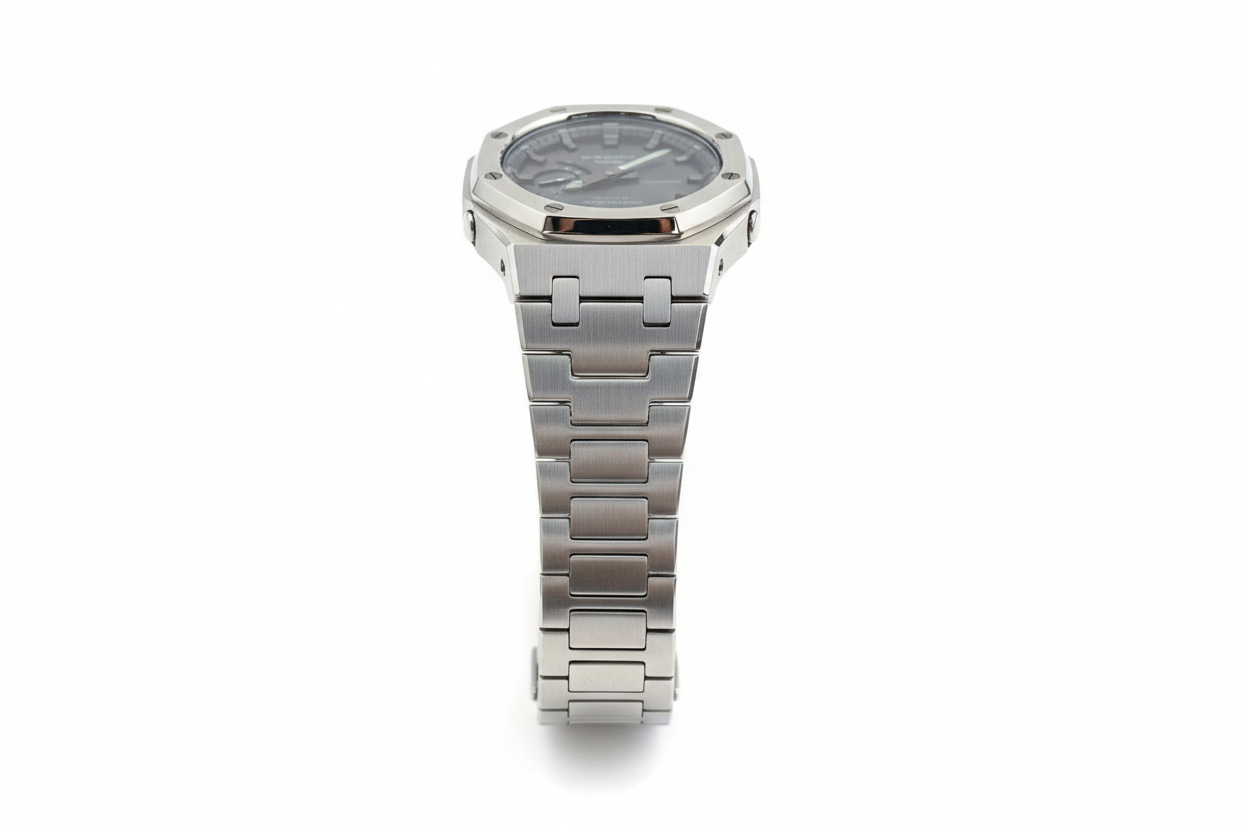 This custom G-Shock modification transforms the iconic GA2100 platform with a striking 44mm all-black dial paired with a polished stainless steel silver case and matching bracelet. Built on the legendary Casioak foundation, this mod combines the watch's renowned durability and compact proportions with elevated aesthetics. The contrasting monochrome design delivers sophisticated versatility—equally at home in professional settings or casual wear. Perfect for collectors seeking a refined alternative to standard colorways, this piece showcases meticulous craftsmanship while maintaining the robust performance you expect from G-Shock engineering.